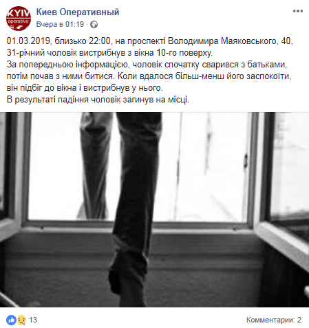 В пятницу, 1 марта, в Киеве мужчина выпрыгнул из окна многоэтажки. Инцидент произошел на проспекте Владимира Маяковского, 40. Об этом "Киев Оперативный" сообщает на странице в Facebook.