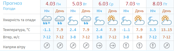 Ресурс Мeteoprog.ua обещает +8...+10 и дождь 4 и 5 марта. Среда, по данным этого ресурса, будет немного прохладнее, до +6 днем. В четверг-пятницу, 7 и 8 марта, потеплеет до +11, осадков не будет. Выходные будут мокрыми, дневная температура +7...+9.