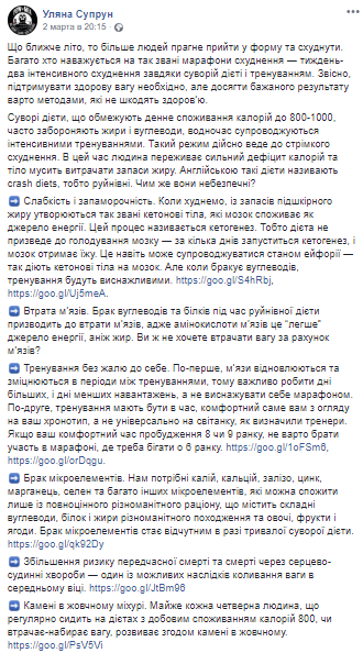 И.о. министра здравоохранения Украины Ульяна Супрун отмечает разрушительное действие подобного марафона похудения, который действительно, ведет к стремительному сбросу веса, но при этом у человека наблюдается дефицит калорий. На английском такие диеты называют crash diets, то есть разрушительные.