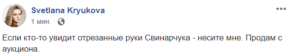 "Если кто-то увидит отрезанные руки Свинарчука (первая фамилия Гладковского. – Прим. ред.) – несите мне. Продам с аукциона", – пишет заместитель главного редактора "Страны" Светлана Крюкова у себя в Facebook, напоминая, что Порошенко когда-то обещал "руки поотрубать тем, кто крадет у армии".