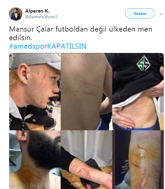 Одному из соперников из клуба Сакарьяспор Мансур Чалар даже порезал лицо. Видео распространил ресурс Yeni Şafak в своем Twitter. На нем четко видно, как игрок под 72 номером наносит уколы соперникам каким-то предметом.