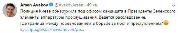 "Полиция Киева обнаружила под офисом кандидата в президенты Зеленского элементы аппаратуры прослушивания. Ведется расследование. Где граница между соревнованием в борьбе за пост и преступлением?", - написал министр в своем микроблоге в соцсети Twitter.