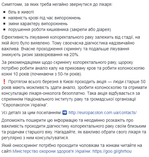 В Украине объявили март месяцем, посвященным борьбе с колоректальным раком. По всему миру традиционно проходят акции и различные события, чтобы привлечь внимание к проблеме этого вида рака. В течение всего марта в Киеве проходит акция - люди старше 50 лет имеют возможность сдать анализ, сделать колоноскопию и получить консультацию врача-онколога бесплатно.