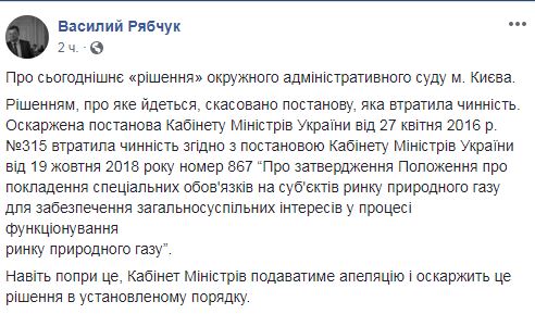 "Решением, о котором идет речь, отменено постановление, которое утратило силу. Обжалованное постановление Кабинета министров Украины от 27 апреля 2016 года №315 утратило силу согласно постановлению Кабинета министров Украины от 19 октября 2018 года №867 "Об утверждении положения о возложении специальных обязанностей на субъектов рынка природного газа для обеспечения общественных интересов в процессе функционирования рынка природного газа", - написал Рябчук.