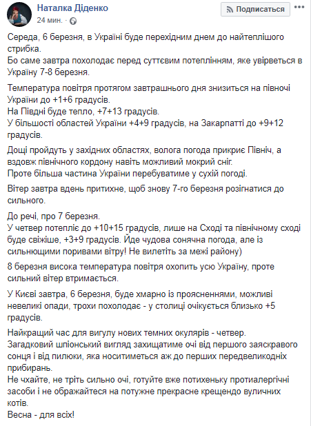 "Лучшее время для выгула новых темных очков - четверг". Синоптик рассказала, какая погода будет в Украине накануне 8 Марта
