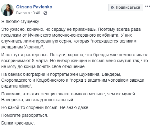 На банках оказались биографии и портреты жен Шухевича, Бандеры, Скоропадского и Коцюбинского и фраза, что "рядом с выдающимся мужчиной всегда выдающаяся женщина". "Понимаю, что этих женщин знают намного меньше, чем их мужей. Наверняка, их вклад колоссальный. Но какой-то спорный посыл. Не знаю даже. Помогите разобраться. Банки красивые", - резюмировала Павленко.