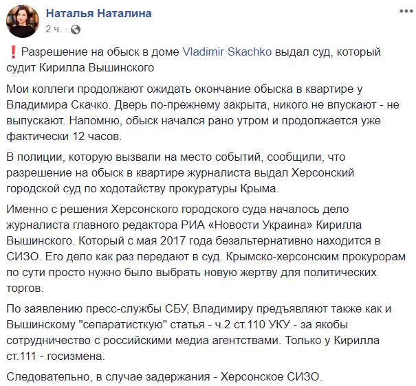 Обыски в квартире известного киевского журналиста Владимира Скачко, которые с утра 5 марта проводит СБУ, санкционировал Херсонский суд по требованию прокуратуры Крыма, а сами обыски еще продолжаются.