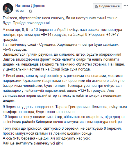 "В Киеве день, когда улицы расцветут розовыми тюльпанами, желтыми нарциссами, сиреневыми гиацинтами и красными от активного забега по базарчикам мужчинами, будет теплым. Температура воздуха ожидается самой высокой в ​​ближайшей перспективе: днем ​​+12...+15 градусов. Но остается порывистый ветер, и могут набежать облака с небольшим дождем", - написала Наталья Диденко.