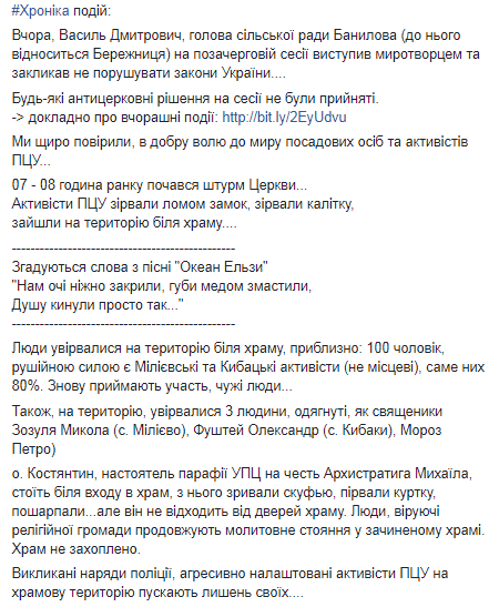 При этом в УПЦ МП уже давно сообщили о схеме, при помощи которой ее храмы захватываются: сначала проводятся собрания, на которых понятие религиозной общины подменяется территориальной, проводится голосование "за переход в ПЦУ", в котором зачастую принимают участие даже не местные жители, после этого замки с храмов срезаются, происходят подобные вчерашнему инциденты. Между тем, по состоянию на конец февраля 2019 года только 36 приходов УПЦ МП из 12 тысяч по Украине перешли в ПЦУ, еще 23 были захвачены рейдерским путем.