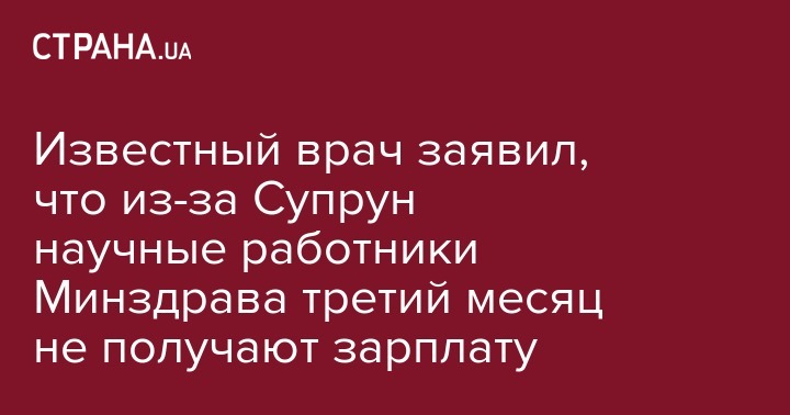 "се 24 научно-исследовательских института, работающие в системе Минздрава Украины, уже третий месяц не имеют возможность выплачивать зарплату своим сотрудникам. Хотя соответствующие финансы Минздравом давно получены. Основание – личное распоряжение госпожи Супрун", - заявляет Глузман.