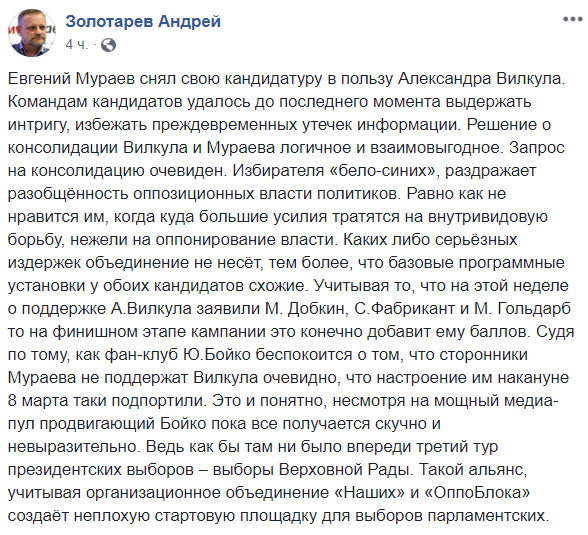 "Евгений Мураев снял свою кандидатуру в пользу Александра Вилкула. Командам кандидатов удалось до последнего момента выдержать интригу, избежать преждевременных утечек информации. Решение о консолидации Вилкула и Мураева логичное и взаимовыгодное. Запрос на консолидацию очевиден. Избирателя "бело-синих" раздражает разобщенность оппозиционных власти политиков. Равно как не нравится им, когда куда большие усилия тратятся на внутривидовую борьбу, нежели на оппонирование власти. Каких-либо серьезных издержек объединение не несет, тем более, что базовые программные установки у обоих кандидатов схожие", – считает Андрей Золотарев.