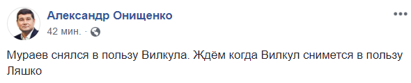 "Совсем на днях Мураев рассказывал, что все опросы врут (читай – он еще ого-го!). Только вчера появились новые борды с его портретом (Мураев – наш президент!). А сегодня он снимает свою кандидатуру – не подумайте, что в пользу единственного кандидата, который имеет хотя бы теоретические шансы попасть во второй тур, Юрия Бойко, – нет, в в пользу Вилкула, который таких шансов не имеет вовсе. Ничего личного – только бизнес. Ау, фанаты Мураева, кто из нас был прав?" – спрашивает политолог Михаил Погребинский.