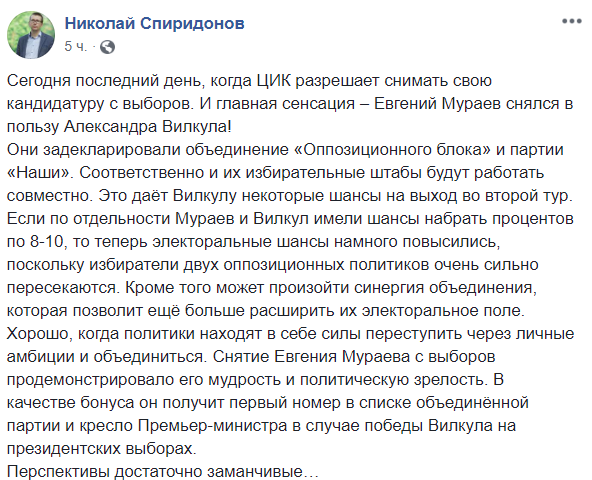 "Хорошо, когда политики находят в себе силы переступить через личные амбиции и объединиться. Снятие Евгения Мураева с выборов продемонстрировало его мудрость и политическую зрелость. В качестве бонуса он получит первый номер в списке объединенной партии и кресло премьер-министра в случае победы Вилкула на президентских выборах.