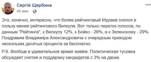 "Это, конечно, интересно, что более рейтинговый Мураев снялся в пользу менее рейтингового Вилкула. Вот только переток голосов, по данным "Рейтинга", к Вилкулу 12%, к Бойко – 26%, а к Зеленскому – 29%. Поздравим Владимира Александровича с очередным приходом нескольких десятых процента за бесплатно. Вообще в удивительное время живем. Политическая тусовка обсуждает снятие и поддержку кандидатов с 3% на двоих", – пишет главный редактор РБК-Украина Сергей Щербина.