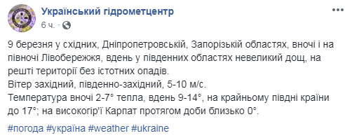 "9 марта в восточных, Днепропетровской, Запорожской областях, ночью на севере Левобережья, а днем в южных областях небольшой дождь, на остальной территории без существенных осадков. Ветер западный, юго-западный, 5-10 м/сек", - сообщают синоптики.