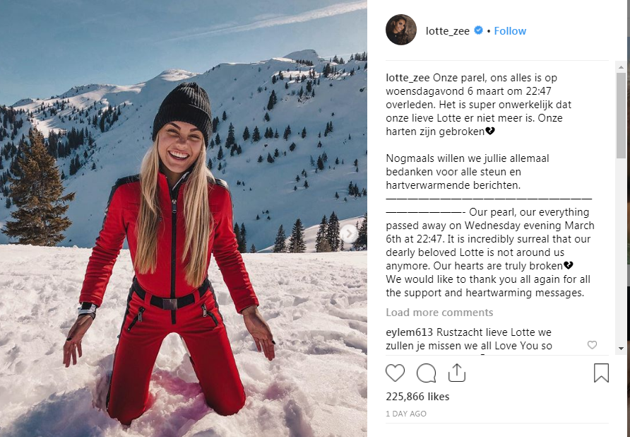 Вечером 6 марта в Мюнхене скончалась 20-летняя нидерландская модель и "Юная Мисс Вселенная-2017" Лотте ван дер Зее. Об этом ее родители сообщили на странице девушки в Инстаграме.