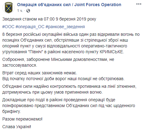 "8 марта российские оккупационные войска один раз открывали огонь по позициям Объединенных сил, обстреляв из стрелкового оружия наш опорный пункт в полосе ответственности оперативно-тактической группировки "Север" в районе населенного пункта Крымское" – говорится в сообщении.