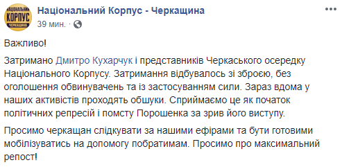 "Задержали Дмитрия Кухарчука и представителей Черкасского отделения Национального Корпуса. Задержание происходило с оружием, без объявления обвинений и с применением силы. Сейчас дома у наших активистов проходят обыски. Воспринимаем это как начало политических репрессий и месть Порошенко за срыв его выступления. Просим жителей Черкасс следить за нашими эфирами и быть готовыми мобилизоваться на помощь собратьям", - говорится в сообщении Нацкорпуса в Facebook.