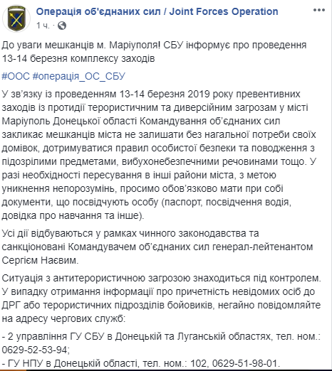В Мариуполе с 13 по 14 марта пройдет спецоперация СБУ по противодействию террористическим и диверсионным угрозам в городе. Об этом сообщает пресс-служба штаба операции Объединенных сил в Facebook.