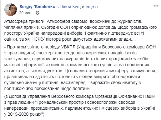 "Атмосфера тревоги. Атмосфера сознательной вражды к журналистам. Навешивание ярлыков. Сегодня ООН обнародует доклад о гражданских свободах в Украине накануне выборов. И фактически подтверждает все те оценки, за которые НСЖУ полтора года преследуется адвокатами власти".
