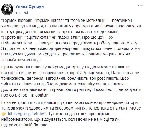 Супрун отметила, что упоминания в СМИ о гормонах счастья, любви и мотивации – с точки зрения науки – неверны, так как речь идет о нейромедиаторах, которые действуют на нейроны в головном мозге и дают человеку ощущения радости, тревожности, счастья.