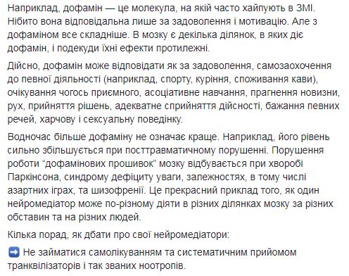 И.о. главы Минздрава Ульяна Супрун развенчала еще один миф, который касается гормона дофамина – его называют также гормоном счастья, гормоном любви и мотивации. Об этом она написала на своей странице в социальной сети Facebook.
