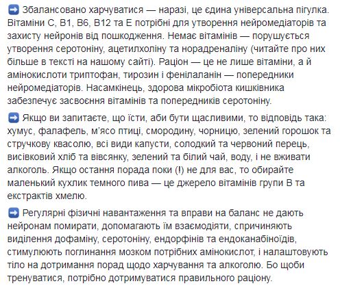 Ульяна Супрун дала несколько советов о том, как заботиться о своих нейромедиаторах и поддерживать нормальный баланс жизни. Она порекомендовала не заниматься самолечением и не принимать систематически транквилизаторы или ноотропические препараты. Также она советует сбалансировано питаться и насытить рацион витаминами С, В1, В6, В12 и Е, так как они необходимы для образования нейромедиаторов и защищают нейроны от повреждения. Если в организме нехватка этих витаминов, то нарушается образование серотонина, ацетилхолина и норадреналина.