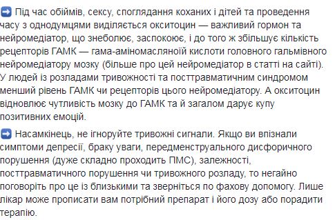 "Во время объятий, секса, созерцания любимых и детей и времяпрепровождения с единомышленниками выделяется окситоцин - важный гормон и нейромедиатор, обезболивающее, который успокаивает, и к тому же увеличивает количество рецепторов ГАМК - гамма-аминомасляной кислоты главного тормозного нейромедиатора мозга. У людей с расстройствами тревожности и посттравматическим синдромом меньший уровень ГАМК или рецепторов этого нейромедиатора. А окситоцин восстанавливает чувствительность мозга к ГАМК и вообще дарит массу положительных эмоций", - объяснила Супрун.