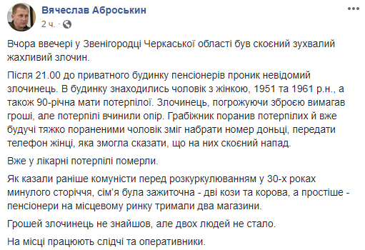 В Звенигородке Черкасской области 12 марта вечером неизвестный застрелил супругов-пенсионеров. Об этом сообщил первый заместитель главы Нацполиции Украины Вячеслав Аброськин на своей странице в Facebook.