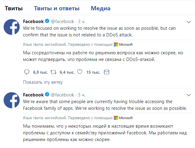 "Мы знаем, что сегодня у многих пользователей возникли проблемы с доступом к приложениям Facebook. Мы стараемся решить проблему как можно быстрее. Но мы можем подтвердить, что проблема не связана с DDoS-атакой", - говорится в сообщении.