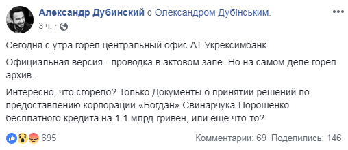 "Сегодня с утра горел центральный офис АТ Укрэксимбанк. Официальная версия - проводка в актовом зале. Но на самом деле горел архив. Интересно, что сгорело? Только Документы о принятии решений по предоставлению корпорации "Богдан" Свинарчука-Порошенко бесплатного кредита на 1,1 млрд гривен, или еще что-то?" - указано в опубликованном сообщении..