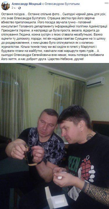 "Выражаю глубокие и искренние соболезнования семье, близким, коллегам и друзьям в связи с трагической смертью работника нашей Администрации - Александра Евгеньевича Бухтатого. Обращаюсь к правоохранительным органам с призывом в максимально короткий срок установить виновных в преступлении и наказать их согласно закону", - сказано в сообщении. Также добавляется, что Бухтатый был честным и порядочным человеком, профессионалом своего дела.