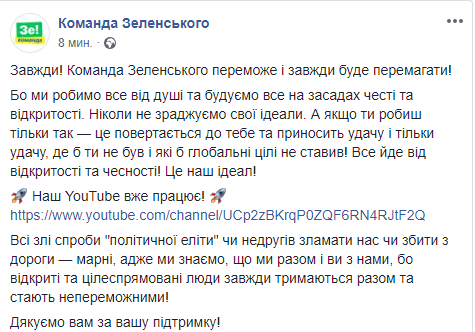 "Наш YouTube уже работает! Все злые попытки "политической элиты" или недругов сломать нас или сбить с пути — напрасны, ведь мы знаем, что мы вместе и вы с нами, потому что открытые и целеустремленные люди всегда держатся вместе и становятся непобедимыми!",- написано в посте.