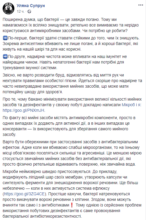 "Стоит быть осторожными при применении средств с антибактериальным эффектом. Ведь когда мы убиваем слабые микроорганизмы, то на их месте обязательно поселятся сильнее и агрессивнее. Это в меньшей степени касается обычных моющих средств без антибактериального действия, которые просто физически тщательно отмывают поверхность, чем обычная вода", - отметила Супрун.