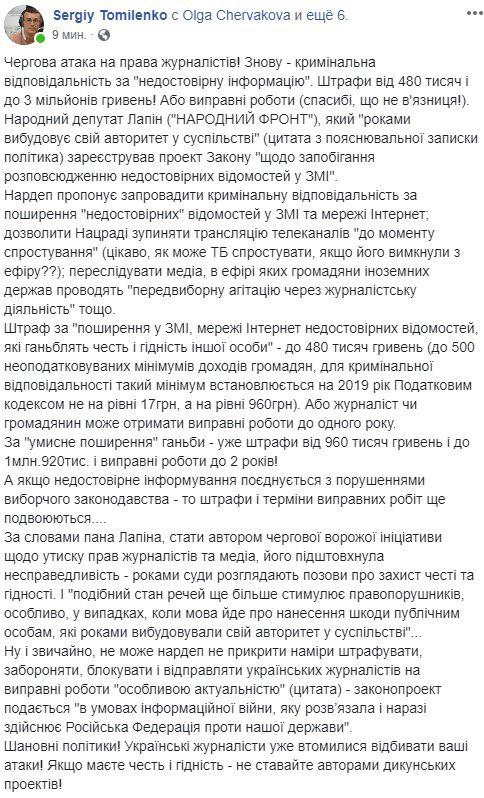 "Очередная атака на права журналистов! Опять - уголовная ответственность за "недостоверную информацию". Штрафы от 480 тысяч до 3 миллионов гривен! Или исправительные работы (спасибо, что не тюрьма!)", - пишет Сергей Томиленко.
