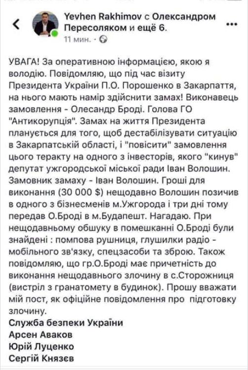 "Прошу считать мой пост, как официальное сообщением о готовящемся преступлении. Во время визита Порошенко в Закарпатье на него намерены совершить покушение", - написал он. Свое сообщение Рахимов оставил в официальной группе Ужгорода в Facebook, однако позже оно было удалено - в том числе и со страницы самого Рахимова.