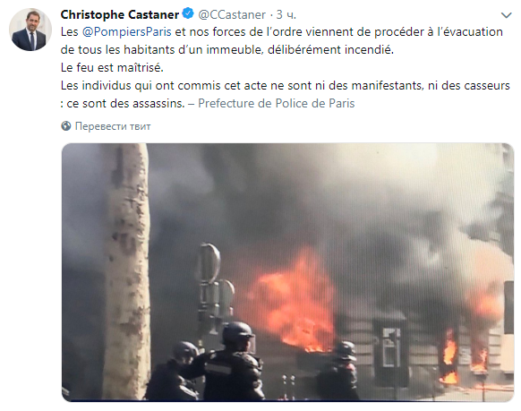"Пожар потушен. Те, кто совершили этот акт, не являются ни манифестантами, ни погромщиками, они - убийцы", - отметил министр.