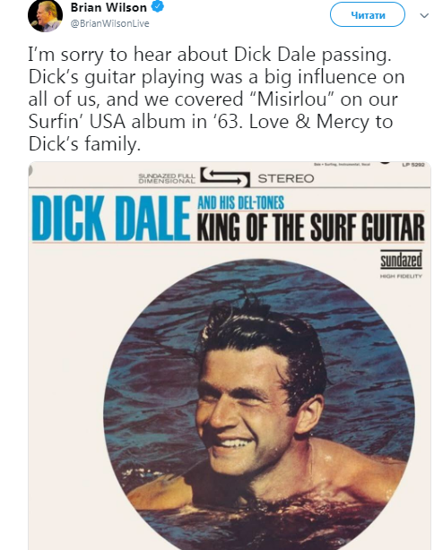 "Мне очень горько слышать о смерти Дика Дейла. Игра Дика на гитаре оказала большое влияние на всех нас, и мы записали Misirlou на нашем альбоме Surfin в США в 1963 году. Любовь и соболезнования семье Дика", - написал Брайан Уилсон.