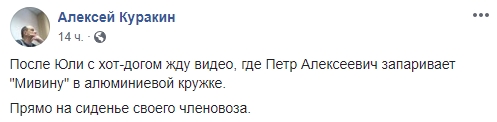 Журналист Алексей Куракин пишет: "После Юли с хот-догом жду видео, где Петр Алексеевич запаривает "Мивину" в алюминиевой кружке. Прямо на сиденье своего членовоза".