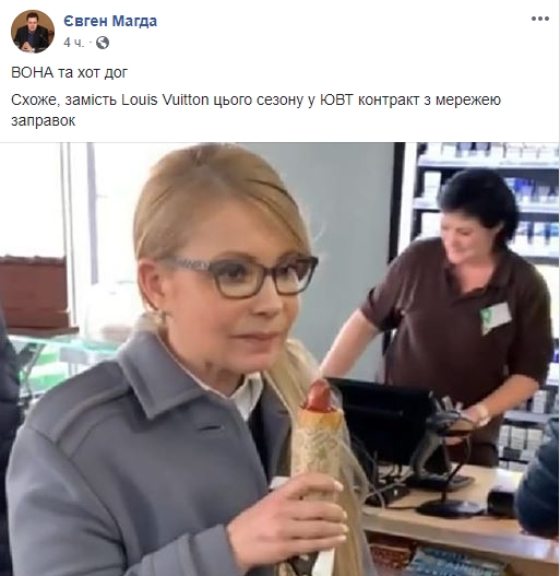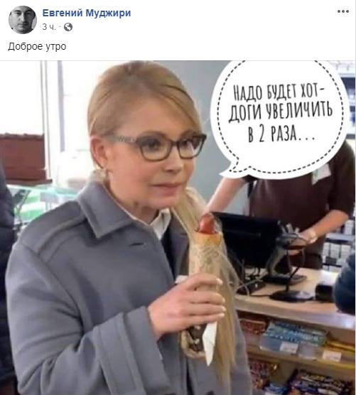 Журналист Евгений Муджири опубликовал фотографию Тимошенко с хот-догом, которая подписана "Надо будет хот-доги увеличить в два раза" – с намеком на ее предвыборные обещания снизить вдвое цену на газ.