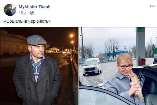 Журналист Михаил Ткач шутит над Тимошенко, сравнивая ее фото с фотографиями других политиков. Пост со снимками Тимошенко с хот-догом и Кличко в кепке он подписал: "Социальное неравенство".