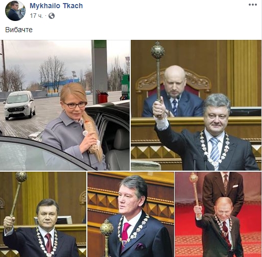 А в другом посте он выложил это же фото Тимошенко в окружении фотографий президентов Украины во время принятия присяги с булавой в руках.