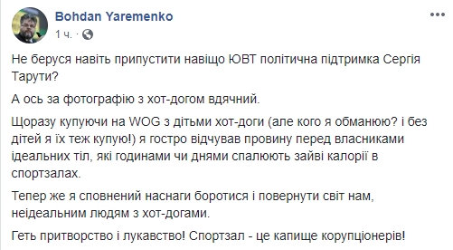 Политик Богдан Яременко: "Не берусь даже предположить зачем ЮВТ политическая поддержка Сергея Таруты? А вот за фотографию с хот-догом благодарен.