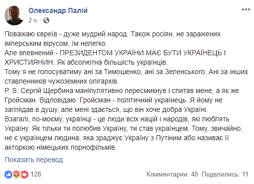 Но уверен - президентом Украины должен быть украинец и христианин. Как абсолютное большинство украинцев. Поэтому я не буду голосовать ни за Тимошенко, ни за Зеленского. Ни других ставленников иностранных олигархов. P. S. Сергей Щербина манипулятивно передернул и спросил, а как же Гройсман. Отвечаю: Гройсман - политический украинец. Я ему не заглядывал в душу, но мне кажется, что он хочет добра Украине. Вообще, по-моему, украинцы - это люди всех наций и народов, которые любят Украину. Как только ты полюбил Украину, ты стал украинцем. Поэтому, конечно, не является украинцем человек, изменяющий Украине с Путиным или тот, кто называет ее актрисой немецких порнофильмов", - написал Александр Палий.