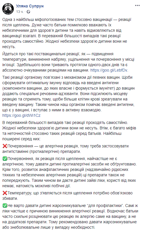 И.о. главы Минздрава Ульяна Супрун продолжила серию статей о пользе прививок. В этот раз министр на своей странице в Facebook развеяла мифы о поствакцинальных реакциях.