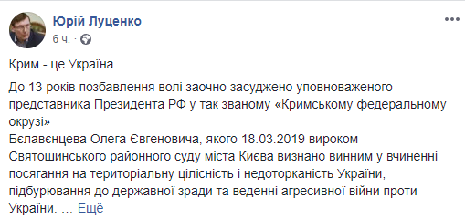 "…18 марта 2018г приговором Святошинского районного суда города Киева признан виновным в совершении посягательства на территориальную целостность и неприкосновенность Украины, подстрекательство к государственной измене и ведении агрессивной войны против Украины", - написал Ю.Луценко в своей странице в соцсети Фейсбук в понедельник.
