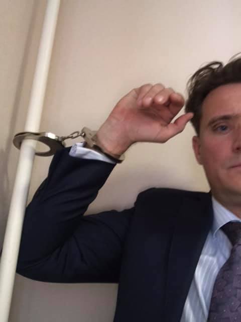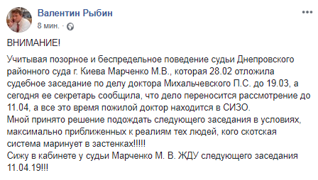 В связи с тем, что судья Днепровского райсуда Киева Мирослава Марченко уже второй раз откладывает рассмотрение дела о госизмене бывшего министра здравоохранения Крыма после аннексии полуострова Петра Михальчевского, его адвокат Валентин Рыбин приковал себя наручниками в кабинете судьи. Он опубликовал соответствующее заявление на своей странице в Facebook.