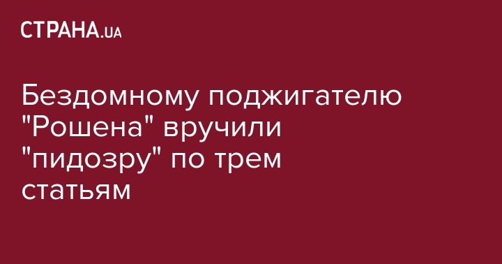 Бездомному, который был задержан вчера по подозрению в поджогах магазинов Roshen в Киеве, полиция вручила уведомления о подозрении сразу по трем статьям Уголовного кодекса Украины. Об этом во вторник, 19 марта, "Страна" узнала из собственных источников в юридических кругах столицы.