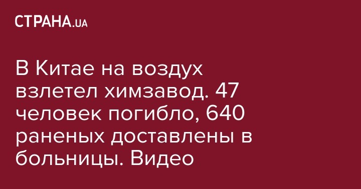 Вчера, 21 марта, в Китае разыгралась очередная техногенная катастрофа. На химзаводе компании "Цзянсу тяньцзяи" прогремела серия мощных взрывов. По последним данным, жертвами трагедии стали 47 человек, еще 90 получили тяжелые травмы: из них 32 пострадавших находятся в критическом состоянии.