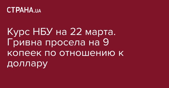 На пятницу, 22 марта, НБУ заметно снизил курс гривны по отношению к основным мировым валютам. Как сообщается на сайте регулятора, гривна сразу "просела" на 9 копеек.